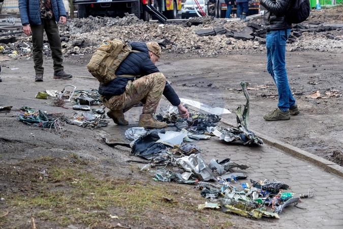 KYIV, UKRAINE - MARCH 21, 2024 - Fragments of a downed Russian missile are seen after a rocket attack on Shevchenkivskyi district of Kyiv, capital of Ukraine., Credit:Pavlo_Bagmut / Avalon
