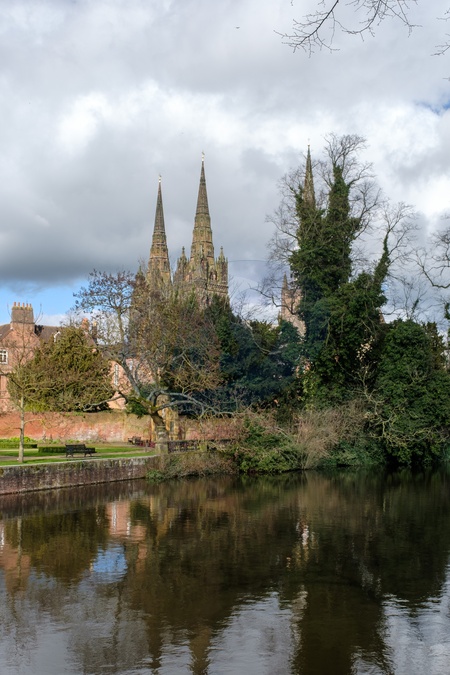 Lichfield Cathedral with Minster pond in the foreground. Lichfield. Staffordshire. United Kingdom. 17 March 2024, Credit:Mark Fairhurst / Avalon