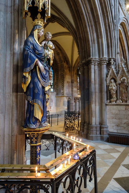 Statue of Mary and baby Jesus with candles. Lichfield Cathedral. Lichfield. Staffordshire. United Kingdom. 17 March 2024, Credit:Mark Fairhurst / Avalon