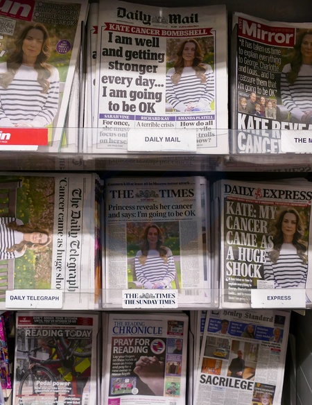 This mornings daily papers with all headlines about Catherine Princess of Wales announcement yesterday that she is undergoing cancer treatment., Credit:Geoffrey Swaine / Avalon