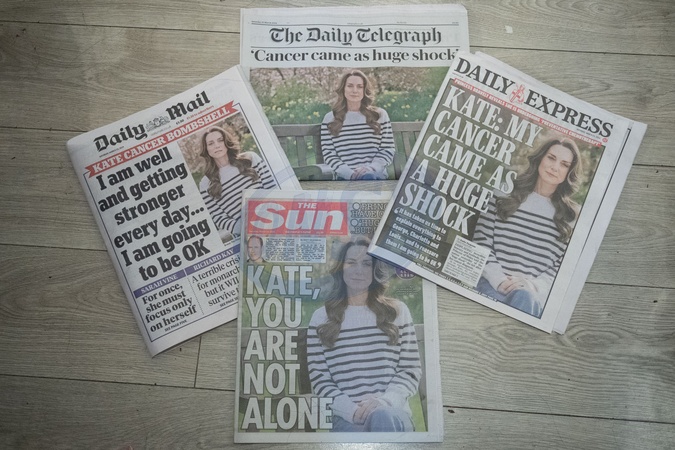 A selection of UK newspaper front pages reacting to Catherine - The Princess Of Wales' announcement that she has cancer and is undergoing chemotherapy - London, London, England, UK on Saturday 23 March, 2024., Credit:Justin Ng / Avalon