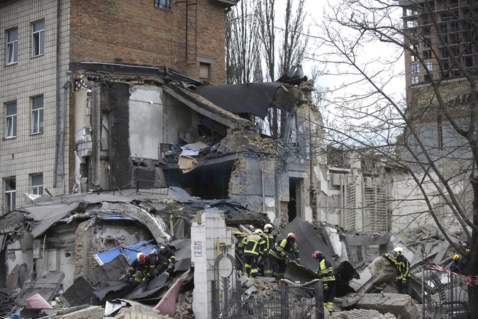 KYIV, UKRAINE - MARCH 25, 2024 - First responders are seen at work at an academic institution in the Pecherskyi district destroyed by falling missile debris after two Russian ballistic missiles launched at the Ukrainian capital by Russian invaders from temporarily occupied Crimea were intercepted by Ukrainian air defence forces over Kyiv Monday morning at approximately 10:30 am local time, Kyiv, capital of Ukraine., Credit:Ruslan Kaniuka / Avalon