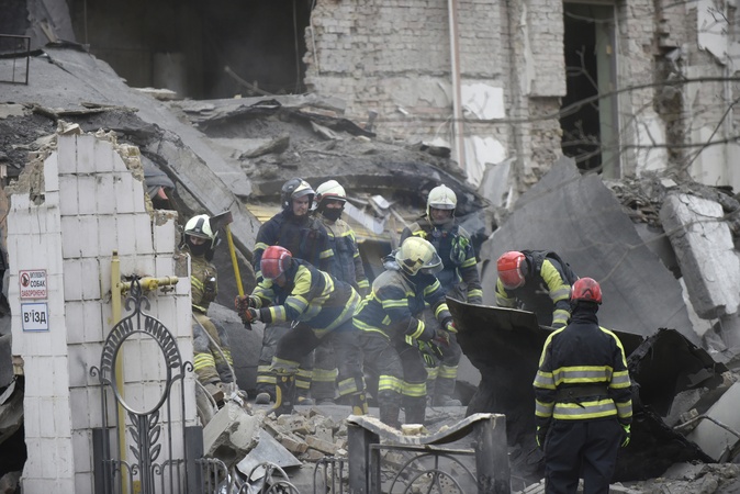 KYIV, UKRAINE - MARCH 25, 2024 - First responders are seen at work at an academic institution in the Pecherskyi district destroyed by falling missile debris after two Russian ballistic missiles launched at the Ukrainian capital by Russian invaders from temporarily occupied Crimea were intercepted by Ukrainian air defence forces over Kyiv Monday morning at approximately 10:30 am local time, Kyiv, capital of Ukraine., Credit:Ruslan Kaniuka / Avalon