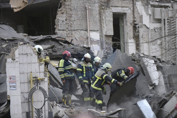 KYIV, UKRAINE - MARCH 25, 2024 - First responders are seen at work at an academic institution in the Pecherskyi district destroyed by falling missile debris after two Russian ballistic missiles launched at the Ukrainian capital by Russian invaders from temporarily occupied Crimea were intercepted by Ukrainian air defence forces over Kyiv Monday morning at approximately 10:30 am local time, Kyiv, capital of Ukraine., Credit:Ruslan Kaniuka / Avalon