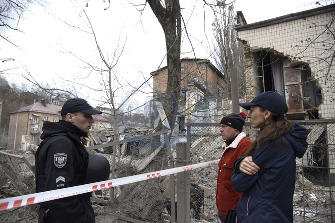 KYIV, UKRAINE - MARCH 25, 2024 - People watch a response effort to damage done by falling Russian missile debris in the Pecherskyi district after two Russian ballistic missiles launched at the Ukrainian capital by Russian invaders from temporarily occupied Crimea were intercepted by Ukrainian air defence forces over Kyiv Monday morning at approximately 10:30 am local time, Kyiv, capital of Ukraine., Credit:Ruslan Kaniuka / Avalon