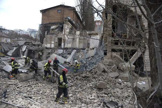 KYIV, UKRAINE - MARCH 25, 2024 - First responders are seen at work at an academic institution in the Pecherskyi district destroyed by falling missile debris after two Russian ballistic missiles launched at the Ukrainian capital by Russian invaders from temporarily occupied Crimea were intercepted by Ukrainian air defence forces over Kyiv Monday morning at approximately 10:30 am local time, Kyiv, capital of Ukraine., Credit:Ruslan Kaniuka / Avalon