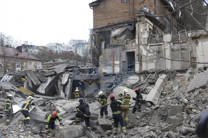 KYIV, UKRAINE - MARCH 25, 2024 - First responders are seen at work at an academic institution in the Pecherskyi district destroyed by falling missile debris after two Russian ballistic missiles launched at the Ukrainian capital by Russian invaders from temporarily occupied Crimea were intercepted by Ukrainian air defence forces over Kyiv Monday morning at approximately 10:30 am local time, Kyiv, capital of Ukraine., Credit:Ruslan Kaniuka / Avalon