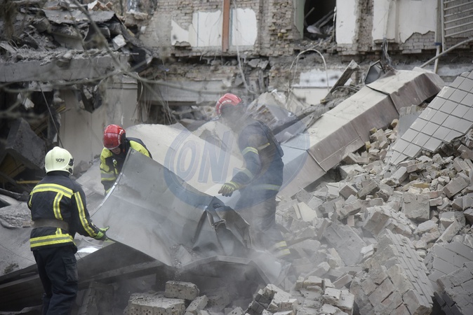 KYIV, UKRAINE - MARCH 25, 2024 - Rescuers remove the rubble at an academic institution in the Pecherskyi district destroyed by falling missile debris after two Russian ballistic missiles launched at the Ukrainian capital by Russian invaders from temporarily occupied Crimea were intercepted by Ukrainian air defence forces over Kyiv Monday morning at approximately 10:30 am local time, Kyiv, capital of Ukraine., Credit:Ruslan Kaniuka / Avalon