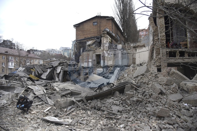 KYIV, UKRAINE - MARCH 25, 2024 - A three-storey non-residential building in the Pecherskyi district shows damage caused by falling missile debris after two Russian ballistic missiles launched at the Ukrainian capital by Russian invaders from temporarily occupied Crimea were intercepted by Ukrainian air defence forces over Kyiv Monday morning at approximately 10:30 am local time, Kyiv, capital of Ukraine., Credit:Ruslan Kaniuka / Avalon