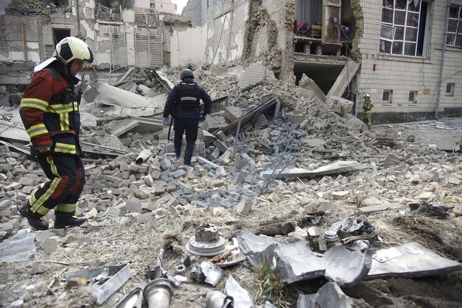 KYIV, UKRAINE - MARCH 25, 2024 - Experts pick up the fragments of a downed Russian rocket at an academic institution in the Pecherskyi district destroyed by falling missile debris after two Russian ballistic missiles launched at the Ukrainian capital by Russian invaders from temporarily occupied Crimea were intercepted by Ukrainian air defence forces over Kyiv Monday morning at approximately 10:30 am local time, Kyiv, capital of Ukraine., Credit:Ruslan Kaniuka / Avalon