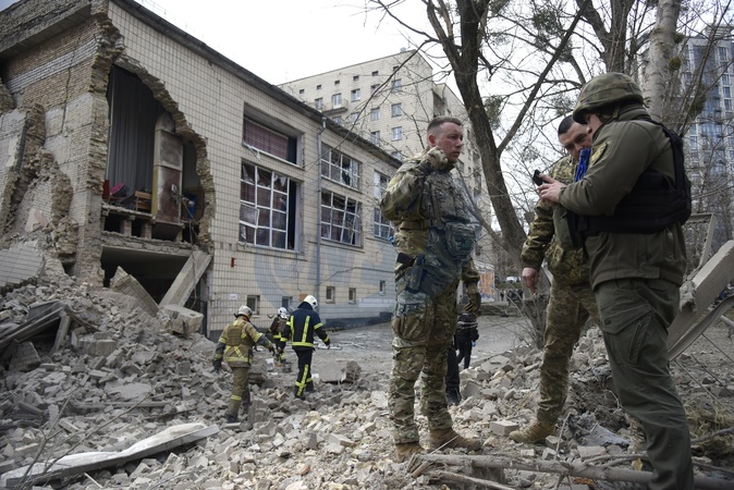 KYIV, UKRAINE - MARCH 25, 2024 - Experts pick up the fragments of a downed Russian rocket at an academic institution in the Pecherskyi district destroyed by falling missile debris after two Russian ballistic missiles launched at the Ukrainian capital by Russian invaders from temporarily occupied Crimea were intercepted by Ukrainian air defence forces over Kyiv Monday morning at approximately 10:30 am local time, Kyiv, capital of Ukraine., Credit:Ruslan Kaniuka / Avalon