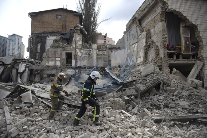 KYIV, UKRAINE - MARCH 25, 2024 - First responders are seen at work at an academic institution in the Pecherskyi district destroyed by falling missile debris after two Russian ballistic missiles launched at the Ukrainian capital by Russian invaders from temporarily occupied Crimea were intercepted by Ukrainian air defence forces over Kyiv Monday morning at approximately 10:30 am local time, Kyiv, capital of Ukraine., Credit:Ruslan Kaniuka / Avalon