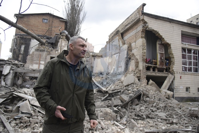 KYIV, UKRAINE - MARCH 25, 2024 - Kyiv city head Vitali Klitschko visits an academic institution in the Pecherskyi district destroyed by falling missile debris after two Russian ballistic missiles launched at the Ukrainian capital by Russian invaders from temporarily occupied Crimea were intercepted by Ukrainian air defence forces over Kyiv Monday morning at approximately 10:30 am local time, Kyiv, capital of Ukraine., Credit:Ruslan Kaniuka / Avalon