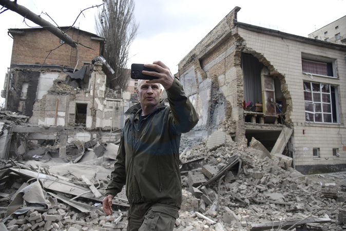 KYIV, UKRAINE - MARCH 25, 2024 - Kyiv city head Vitali Klitschko visits an academic institution in the Pecherskyi district destroyed by falling missile debris after two Russian ballistic missiles launched at the Ukrainian capital by Russian invaders from temporarily occupied Crimea were intercepted by Ukrainian air defence forces over Kyiv Monday morning at approximately 10:30 am local time, Kyiv, capital of Ukraine., Credit:Ruslan Kaniuka / Avalon