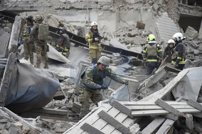 KYIV, UKRAINE - MARCH 25, 2024 - First responders are seen at work at an academic institution in the Pecherskyi district destroyed by falling missile debris after two Russian ballistic missiles launched at the Ukrainian capital by Russian invaders from temporarily occupied Crimea were intercepted by Ukrainian air defence forces over Kyiv Monday morning at approximately 10:30 am local time, Kyiv, capital of Ukraine., Credit:Ruslan Kaniuka / Avalon