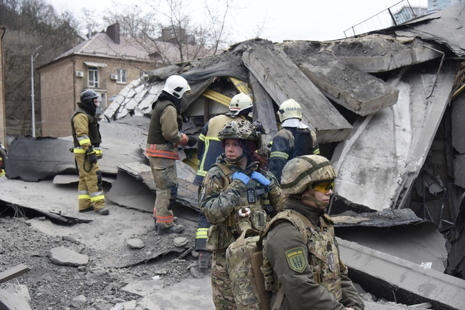 KYIV, UKRAINE - MARCH 25, 2024 - First responders are seen at work at an academic institution in the Pecherskyi district destroyed by falling missile debris after two Russian ballistic missiles launched at the Ukrainian capital by Russian invaders from temporarily occupied Crimea were intercepted by Ukrainian air defence forces over Kyiv Monday morning at approximately 10:30 am local time, Kyiv, capital of Ukraine., Credit:Ruslan Kaniuka / Avalon