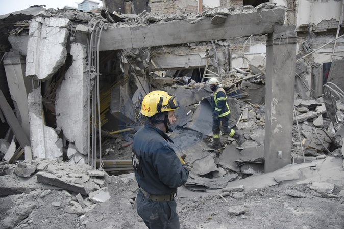 KYIV, UKRAINE - MARCH 25, 2024 - First responders are seen at work at an academic institution in the Pecherskyi district destroyed by falling missile debris after two Russian ballistic missiles launched at the Ukrainian capital by Russian invaders from temporarily occupied Crimea were intercepted by Ukrainian air defence forces over Kyiv Monday morning at approximately 10:30 am local time, Kyiv, capital of Ukraine., Credit:Ruslan Kaniuka / Avalon