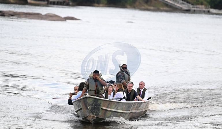 Christophe Béchu, ministre de la transition écologique - Le président Emmanuel Macron et sa délégation, en déplacement en Guyane, rencontrent les habitants de Camopi avec le 3ème REI (régiment étranger d'infanterie) le 25 mars 2024. © Jacques Witt / Pool / Bestimage French Minister in charge of overseas Marie Guevenoux and French Minister for Ecological Transition and Territories' Cohesion Christophe Bechu. French President Emmanuel Macron and his delegation arrive to the village of Camopi on a boat of the 3rd regiment of the French foreign legion cruise on the Oyapock river to visit forest with his delegation and locals in Camopi on March 25, 2024, as part of Macron's two-day visit to the French overseas department of Guiana. //01JACQUESWITT_Camopi032/Credit:Jacques Witt/SIPA/2403252058