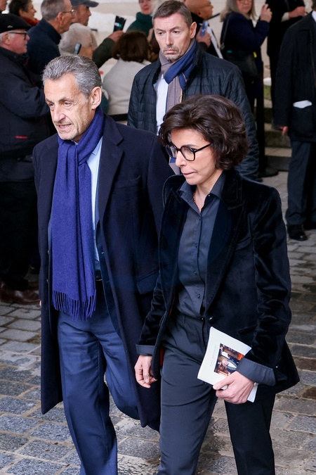 Nicolas Sarkozy, Rachida Dati - Sorties des obsèques de l'ancien ministre de la Culture Frédéric Mitterrand en l'Église Saint-Thomas d'Aquin à Paris. Le 26 mars 2024 © Moreau-Jacovides / Bestimage People seen leaving the funerals of the former Minister of Culture Frédéric Mitterrand in Paris. On March 26th 2024