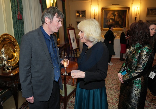 London, UK, 26 March 2024: Queen Camilla speaks to Sir Ian Rankin during a reception to mark the findings of a new research study commissioned by The Queen's Reading Room charity, at Clarence House in London., Credit:Yui Mok / Avalon