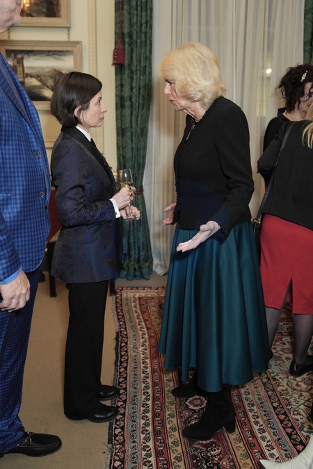 London, UK, 26 March 2024: Queen Camilla speaks to Donna Tartt (left) during a reception to mark the findings of a new research study commissioned by The Queen's Reading Room charity, at Clarence House in London., Credit:Yui Mok / Avalon