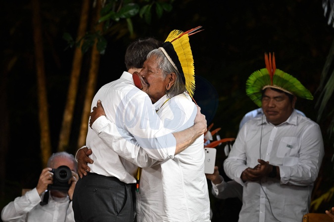 Le président Emmanuel Macron et le président du Brésil Lula (Luiz Inácio Lula da Silva) vont saluer le chef Raoni sur l'île Combu au Brésil