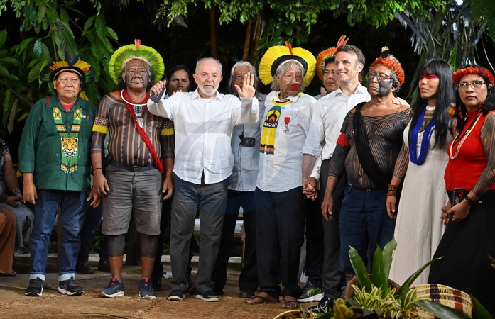 Prezydent Emmanuel Macron i prezydent Brazylii Lula (Luiz Inácio Lula da Silva) szef kuchni Raoni sur l'île Combu w Brazylii
