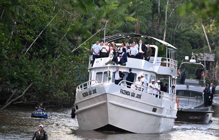 Le président Emmanuel Macron et le président du Brésil Lula (Luiz Inácio Lula da Silva) vont saluer le chef Raoni sur l'île Combu au Brésil le 26 mars 2024. © Jacques Witt / Pool / Bestimage (L to R) The governor of the state of Para Helder Barbalho, French President Emmanuel Macron flies a drone, Brazilian President Luiz Inacio Lula Da Silva and his wife Rosangela 'Janja' Da Silva, and Brazil's Minister of the Environment Marina Silva. President of Brazil Luis Inacio Lula Da Silva and French President Emmanuel Macron arriving on the island Combu in a boat, Brazil, on March 26, 2024//01JACQUESWITT_Combu019/Credit:Jacques Witt/SIPA/2403270121