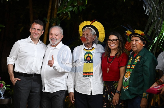 Prezydent Emmanuel Macron i prezydent Brazylii Lula (Luiz Inácio Lula da Silva) szef kuchni Raoni sur l'île Combu w Brazylii