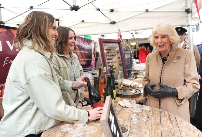 SHREWSBURY, ENGLAND - MARCH 27: Queen Camilla speaks with traders at a wine stall during her visit to the Farmers' Market on March 27, 2024 in Shrewsbury, England., Credit:Chris Jackson / Avalon