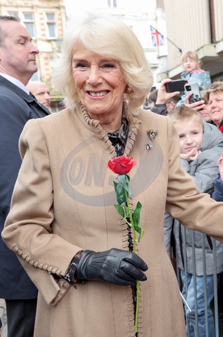 SHREWSBURY, ENGLAND - MARCH 27: Queen Camilla smiles after receiving a red rose from Abi Crighton during her visit to the Farmers' Market on March 27, 2024 in Shrewsbury, England., Credit:Chris Jackson / Avalon