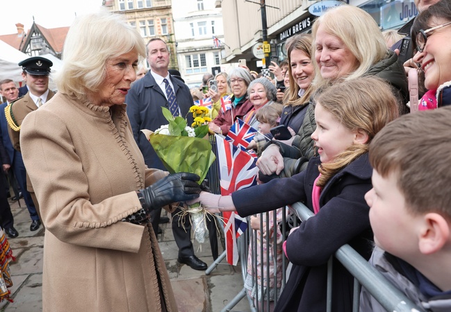 SHREWSBURY, ENGLAND - MARCH 27: Queen Camilla smiles as she meets well-wishers with Union Jack flags during her visit to the Farmers' Market on March 27, 2024 in Shrewsbury, England., Credit:Chris Jackson / Avalon