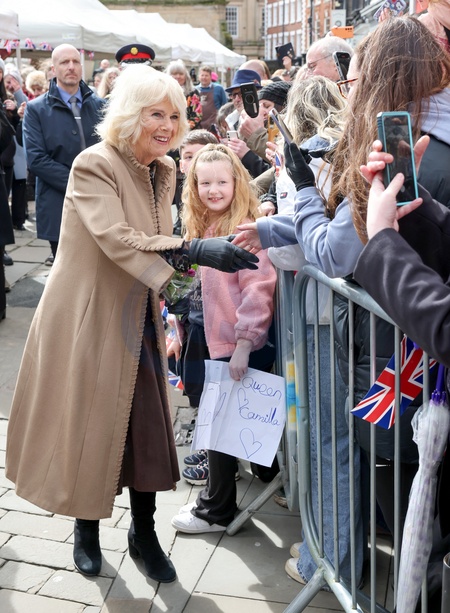SHREWSBURY, ENGLAND - MARCH 27: Queen Camilla smiles as she shakes hands with well-wishers holding Union Jack flags during her visit to the Farmers' Market on March 27, 2024 in Shrewsbury, England., Credit:Chris Jackson / Avalon