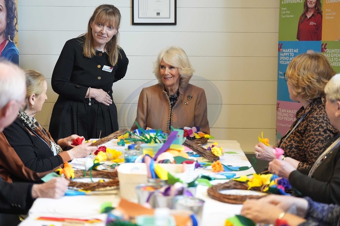 Shrewsbury, Shropshire, UK, 27 March 2024: Queen Camilla tries her hand at crafting a spring wreath during a visit to the recently restored Shrewsbury Flaxmill Maltings in Shropshire., Credit:Jacob King / Avalon