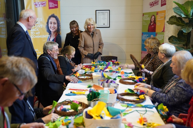 Shrewsbury, Shropshire, UK, 27 March 2024: Queen Camilla tries her hand at crafting a spring wreath during a visit to the recently restored Shrewsbury Flaxmill Maltings in Shropshire., Credit:Jacob King / Avalon