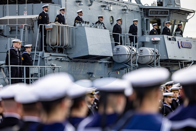 27 March 2024, Schleswig-Holstein, Kiel: Marines have lined up to hand over command of the 3rd Minesweeper Squadron in the naval port of Kiel. The first woman to command a German Navy combat unit., Credit:Axel Heimken / Avalon