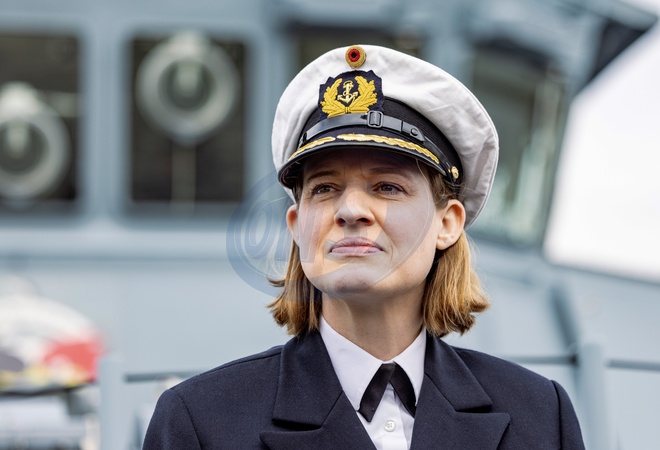 27 March 2024, Schleswig-Holstein, Kiel: Frigate Captain Inka von Puttkamer stands on the deck of the minesweeper "Siegburg" after handing over command of the 3rd Minesweeper Squadron. Von Puttkamer is the first woman to take command of a German Navy combat unit., Credit:Axel Heimken / Avalon