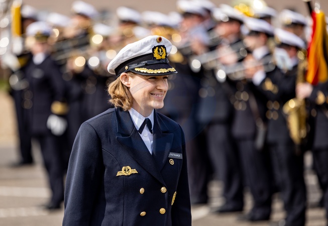 27 March 2024, Schleswig-Holstein, Kiel: Frigate Captain Inka von Puttkamer stands at the handover of command of the 3rd Minesweeper Squadron in the naval port of Kiel. Von Puttkamer is the first woman to take command of a German Navy combat unit., Credit:Axel Heimken / Avalon