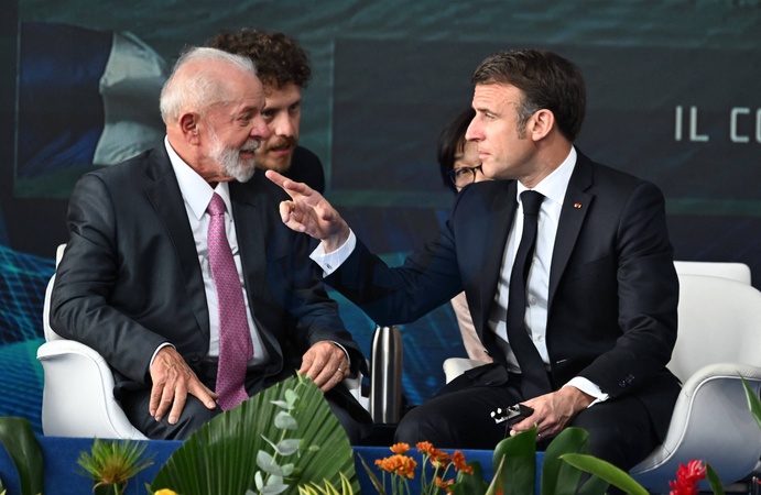 Le président français Emmanuel Macron et son homologue le président brésilien, Luis Inacio Lula da Silva arrivent à la base sous-marin d'Itaguai pour le lancement du sous-marin Tonelero au Brésil, le 27 mars 2024. © Jacques Witt/Pool/Bestimage Emmanuel Macron and President of Brazil Luis Inacio Lula Da Silva arriving on he submarine base of Itaguai for the launch of the submarine Tonelero, in Brazil, on March 27, 2024.