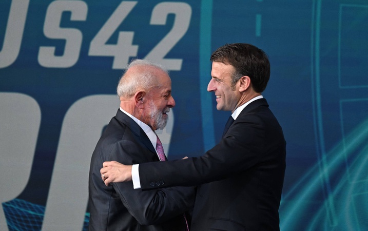Le président français Emmanuel Macron et son homologue le président brésilien, Luis Inacio Lula da Silva arrivent à la base sous-marin d'Itaguai pour le lancement du sous-marin Tonelero au Brésil