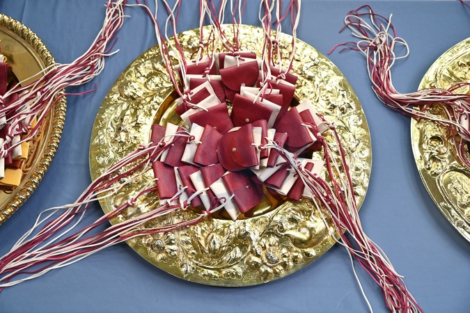 The two purses: one red and one white, containing Maundy Money are seen in a bowl before being distributed. In the white purse are a set of specially minted silver Maundy coins and in the Red Purse a Ł5 coin which features the image of a Tudor Dragon, and a 50p coin commemorating the RNLI, in Worcester Cathedral, western England on March 28, 2024.. Maundy Thursday is the Christian holy day falling on the Thursday before Easter. The monarch commemorates Maundy by offering 'alms' to senior citizens. Each recipient receives two purses, one red and one white., Credit:JUSTIN TALLIS / Avalon