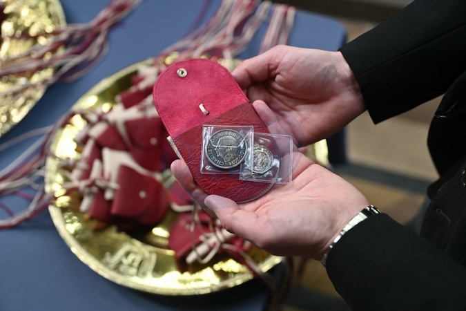 The red purses contains a Ł5 coin which features the image of a Tudor Dragon, and a 50p coin commemorating the RNLI as Britain's Queen Camilla distributes the Maundy Money, in Worcester Cathedral, western England on March 28, 2024. Maundy Thursday is the Christian holy day falling on the Thursday before Easter. The monarch commemorates Maundy by offering 'alms' to senior citizens. Each recipient receives two purses, one red and one white., Credit:JUSTIN TALLIS / Avalon