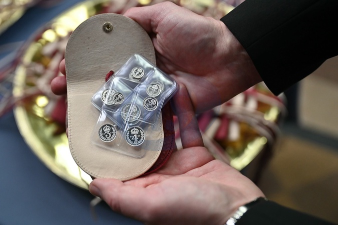 The white purses contains a set of specially minted silver Maundy coins as Britain's Queen Camilla distributes the Maundy Money, in Worcester Cathedral, western England on March 28, 2024. Maundy Thursday is the Christian holy day falling on the Thursday before Easter. The monarch commemorates Maundy by offering 'alms' to senior citizens. Each recipient receives two purses, one red and one white., Credit:JUSTIN TALLIS / Avalon