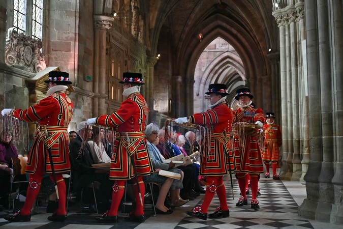 Yeomanry guards carry the bowls containing the red and white purses with the Maundy money inside in Worcester Cathedral, western England on March 28, 2024. Maundy Thursday is the Christian holy day falling on the Thursday before Easter. The monarch commemorates Maundy by offering 'alms' to senior citizens. Each recipient receives two purses, one red and one white., Credit:JUSTIN TALLIS / Avalon