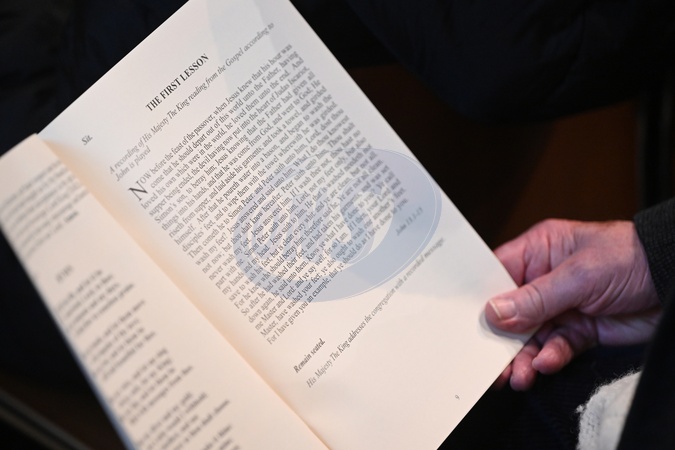 The reading from The Gospel according to John made by Britain's King Charles III is seen in the order of Service for the Royal Maundy Service where Britain's Queen Camilla distributes the Maundy money to 75 men and 75 women, mirroring the age of the monarch, in Worcester Cathedral, western England on March 28, 2024, to thank them for their outstanding Christian service and for making a difference to the lives of people in their local communities. Maundy Thursday is the Christian holy day falling on the Thursday before Easter. The monarch commemorates Maundy by offering 'alms' to senior citizens. Each recipient receives two purses, one red and one white., Credit:JUSTIN TALLIS / Avalon