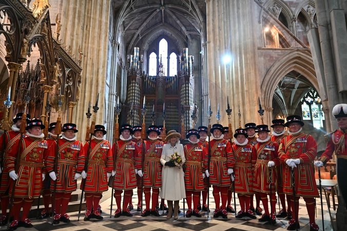 Britain's Queen Camilla (C) holds a Nosegay bouquet as she poses for a photograph with the Yeomen of the Guard during the Royal Maundy Service where she distributes the Maundy money to 75 men and 75 women, mirroring the age of the monarch, in Worcester Cathedral, western England on March 28, 2024, to thank them for their outstanding Christian service and for making a difference to the lives of people in their local communities. Maundy Thursday is the Christian holy day falling on the Thursday before Easter. The monarch commemorates Maundy by offering 'alms' to senior citizens. Each recipient receives two purses, one red and one white., Credit:JUSTIN TALLIS / Avalon