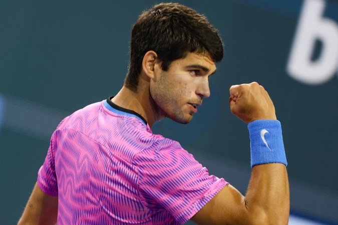 Carlos Alcaraz (ESP) lors de l'Open de tennis de Miami au Hard Rock Stadium à Miami, Floride, Etats-Unis, le 28 mars 2024. © Panoramic/Bestimage Miami Open at Hard Rock Stadium in Miami Gardens, Florida, United States, on March 28, 2024.