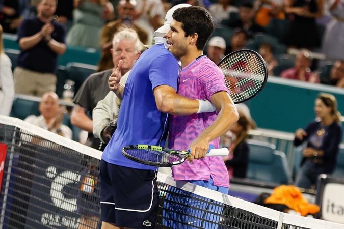 Grigor Dimitrov (BUL) avec Carlos Alcaraz (ESP) lors de l'Open de tennis de Miami au Hard Rock Stadium à Miami, Floride, Etats-Unis, le 28 mars 2024. © Panoramic/Bestimage Miami Open at Hard Rock Stadium in Miami Gardens, Florida, United States, on March 28, 2024.