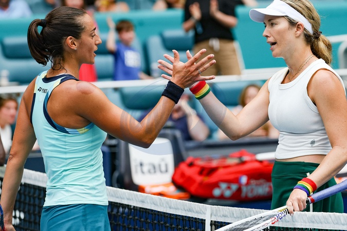Danielle Rose Collins (USA) avec Caroline Garcia (FRA) lors de l'Open de tennis de Miami au Hard Rock Stadium à Miami, Floride, Etats-Unis, le 28 mars 2024. © Panoramic/Bestimage Miami Open at Hard Rock Stadium in Miami Gardens, Florida, United States, on March 28, 2024.