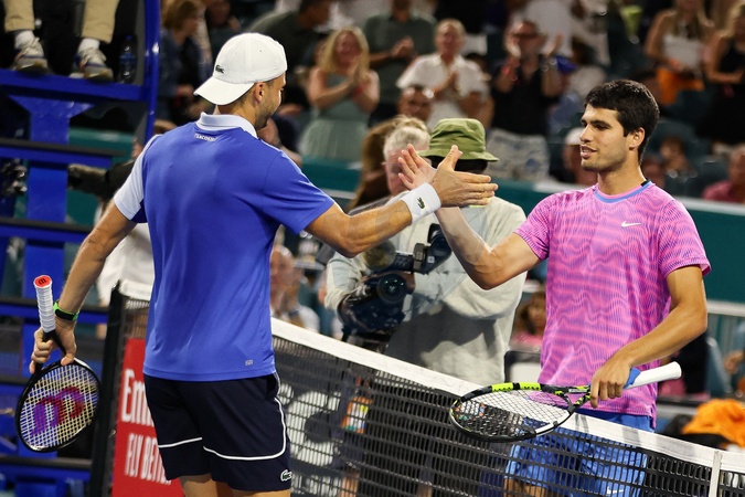 Grigor Dimitrov (BUL) avec Carlos Alcaraz (ESP) lors de l'Open de tennis de Miami au Hard Rock Stadium à Miami, Floride, Etats-Unis, le 28 mars 2024. © Panoramic/Bestimage Miami Open at Hard Rock Stadium in Miami Gardens, Florida, United States, on March 28, 2024.